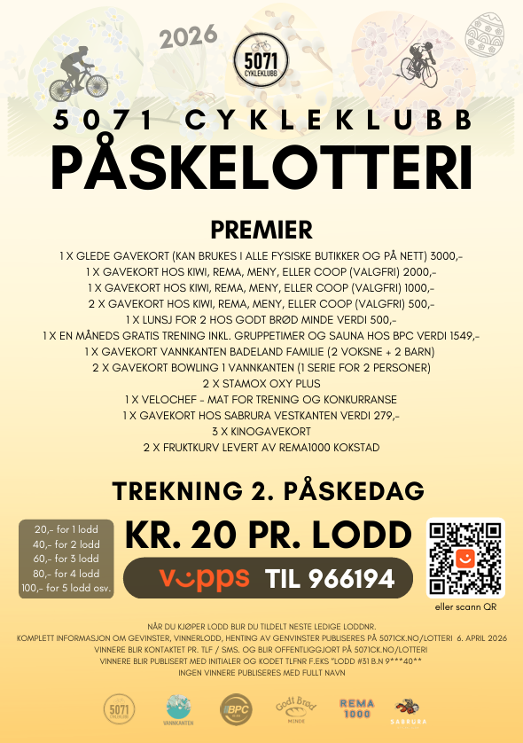 Påskelotteriet – en lett og hyggelig måte for medlemmer, venner av klubben og alle andre å bidra til miljøet vårt. Ved å kjøpe lodd støtter du arbeidet vi gjør for å skape aktivitet, fellesskap og gode opplevelser gjennom hele sesongen. Lotteriet er enkelt å delta i, premiene er fine, og inntektene går uavkortet til tiltak som kommer hele klubben til gode. Dette er en lavterskel dugnad som betyr mye for oss, og vi setter stor pris på alle som blir med.